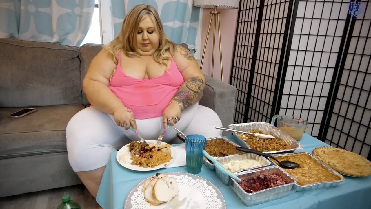 It's Ivy's favorite holiday, so she's cooked herself an entire feast and she intends to eat it all! Watch Ivy greedily scarf down her dinner until she's so full that she's gagging and fears she may become ill. Her belly swells and bloats to enormous proportions as she eats a meal meant for 6 or more all to herself.
